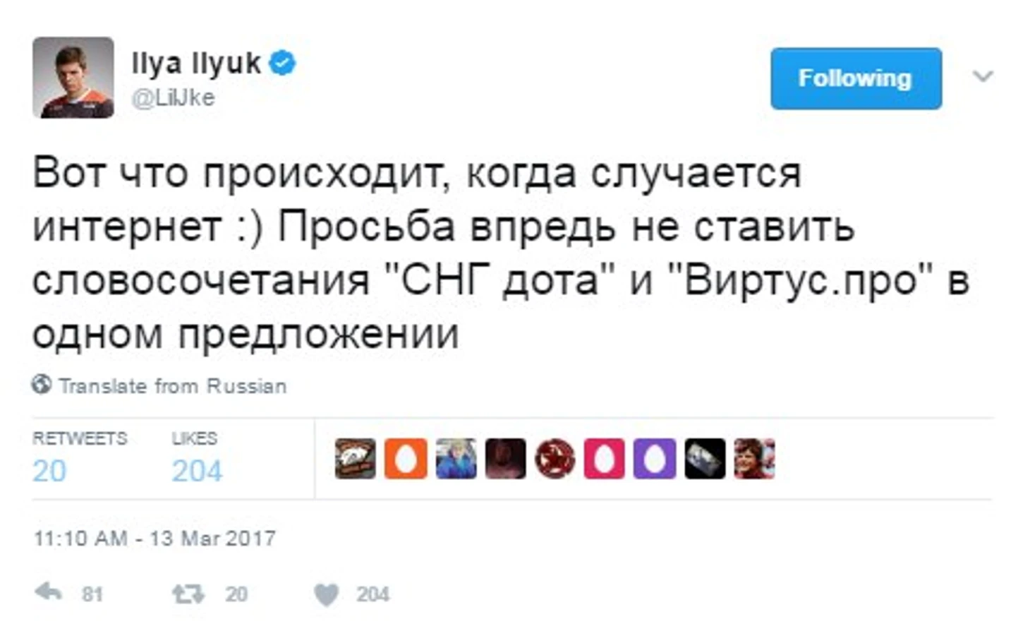 Сегодня по части ведения твиттера, да и социальных сетей в целом, Илья уступает только Дмитрию Маликову. Каждый его пост вызывает такой шквал эмоций, что мама не горюй. Открытка Нахазу со словами «ez for Vega» – настоящий триумф SMM. Эта фантастическая бескомпромиссность, острый язык и навыки трэштока нашим довольно консервативным сообществом воспринимается чересчур резко. Однако он и Ноуван задают такую планку, к которой в современной доте пока что никто и приблизиться не может.