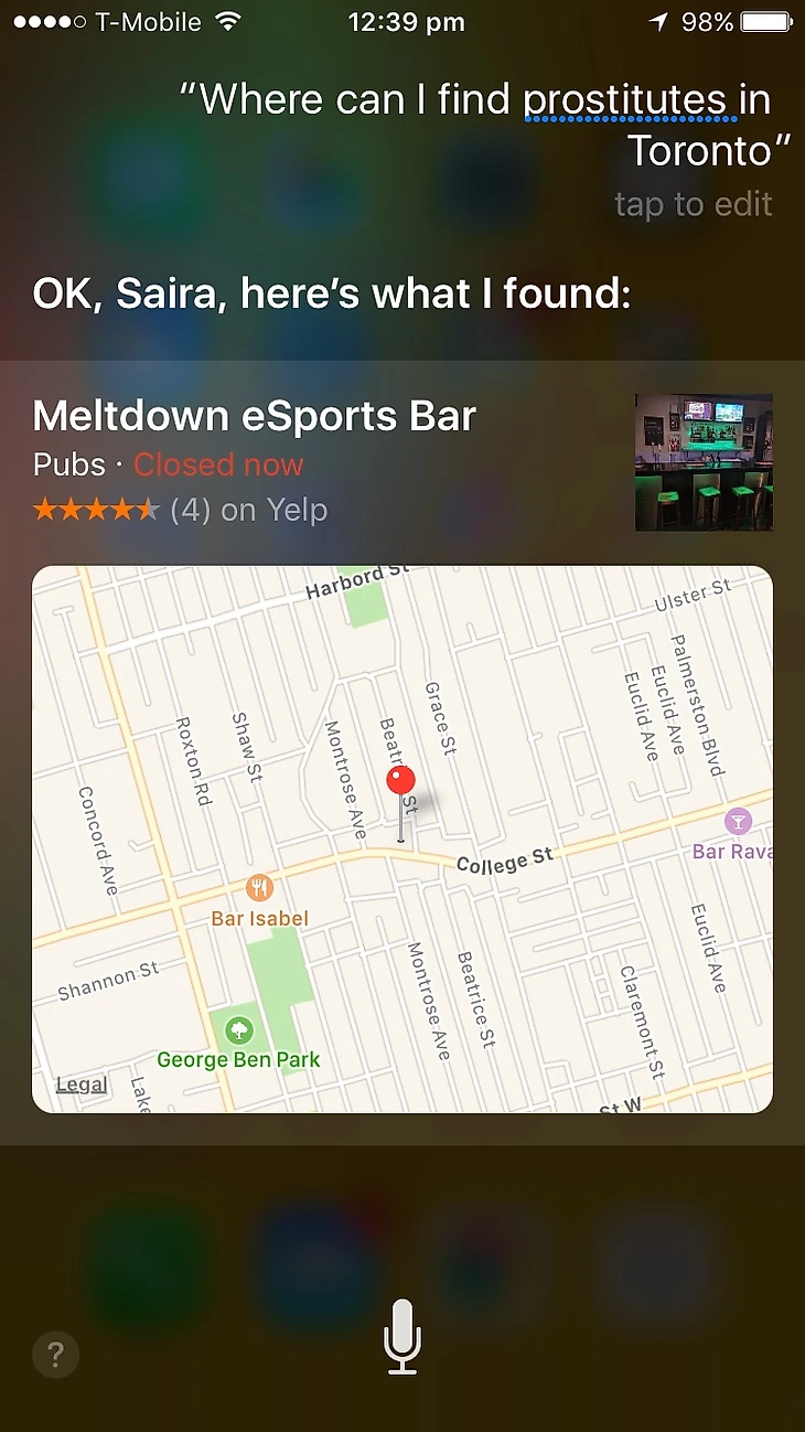 Siri перепутала киберспортивный бар в Торонто с борделем