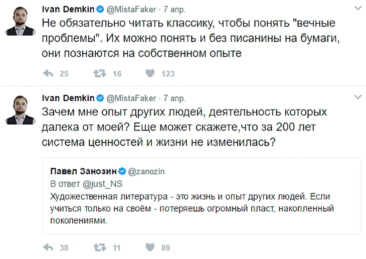 3) Двойка по русскому и литературе за сочинение о любимом герое. Я выбрал Печорина. Оказалось, что Печорин - неформат, он мерзавец, подонок и вообще челик токсичный. А раз я такого героя выбрал, значит, я тоже мерзавец, подонок и токсичный, давай сюда дневник. Примерно такое положение дел и заставляет потом считать, что на фиг эту муть читать надо. Лет 10 после школы за книгу (не считая специализированной литературы, конечно) не брался, потому что школа всё желание к чёртовой матери отбила. А у парней в твиттере правда всё равно своя. Один художественную литературу любит, другой - нет.