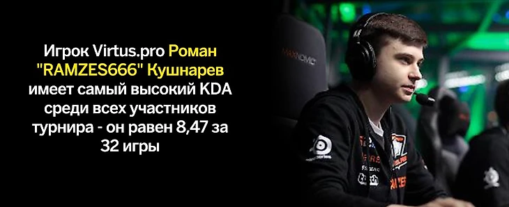 7. Игрок Virtus.pro Роман «RAMZES666» Кушнарев имеет самый высокий KDA среди всех участников турнира – 8,47 за 32 игры.