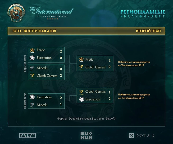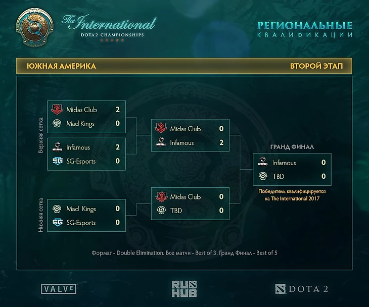 Три коллектива от региона попадают на The International 7Групповая стадия пройдет в формате Round Robin с матчами Bo1Коллектив, занявший 1 место по итогам групповой стадии, попадает на The International 7Команды, занявшие 2-5 места, выходят в плей-оффПлей-офф проходит в формате GSL с матчами Bo3Победители верхней и нижней сетки попадают на The International 7