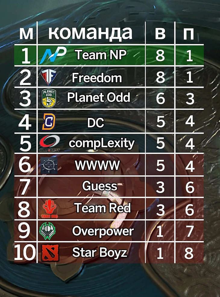 * По результатам переигровки Team NP – Team Freedom [1:0] Team NP заняли 1 место