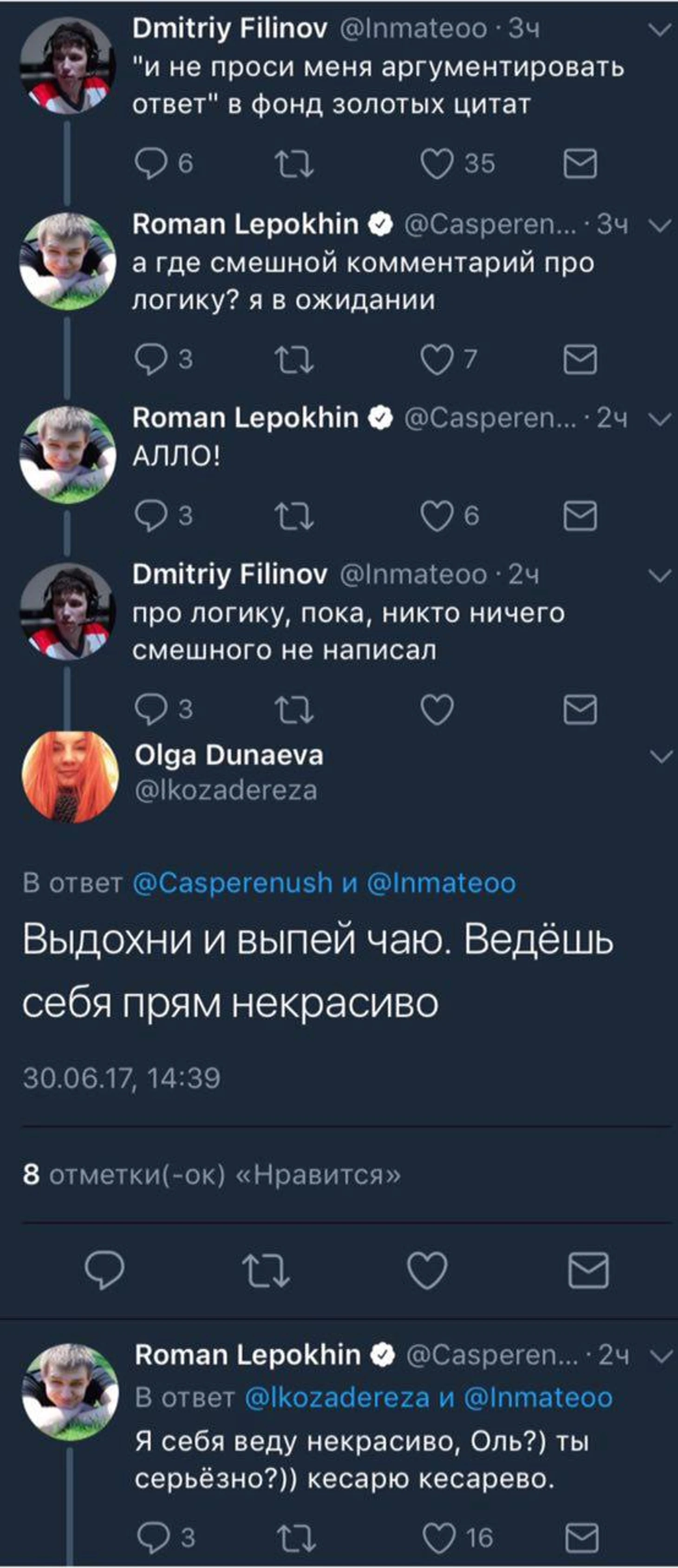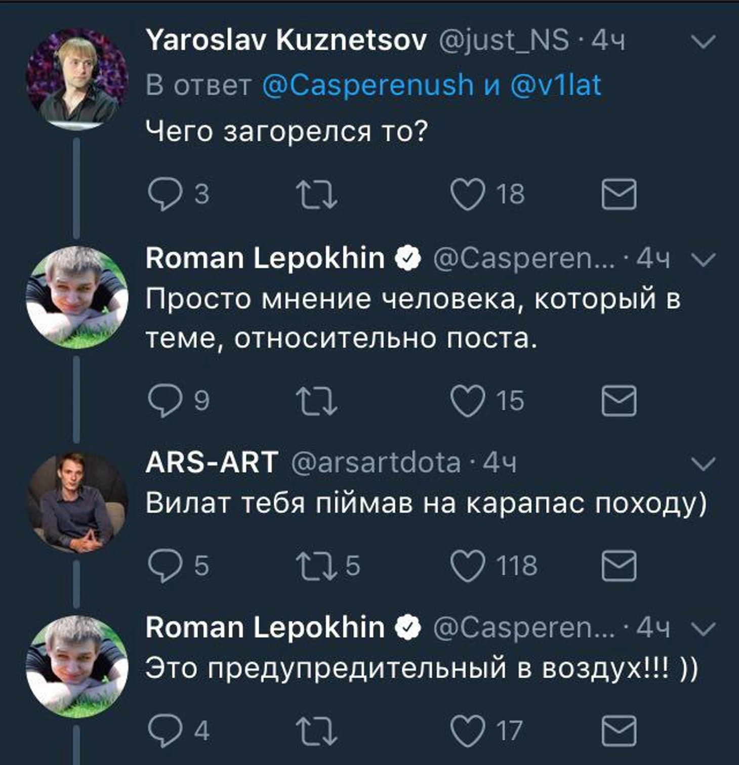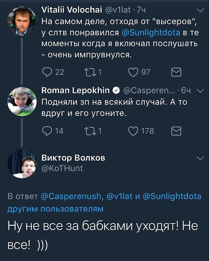 Комментатор Виталий «V1lat» Волочай спровоцировал конфликт с SLTV – прямым конкурентом студии RuHUB, на которую Виталий работает. Хватило одного поста в Телеграм.«Квалы [на TI7] как всегда были классными. 8 дней веселухи, из которых последние 5 – как всегда супер-марафон, подарили очень много крутых эмоций. А то, что где-то там «очень низкий уровень игры» – это пожалуй проблемы тех у кого этот уровень высокий, или тех у кого 98 зрителей на стриме», – намекнул Виталий на жидкий онлайн SLTV.Камень в огород родной студии не смог оставить без внимания Роман «CaspeR» Лепехин.Ярослав «NS» Кузнецов и Сергей «Smile» Ревин попытались разрядить обстановку.Вроде бы даже подействовало. Каспер слегка оттаял.Но затем на защиту Вилата ринулся чуть ли не весь RuHUB.Неожиданно Вилат решил найти позитивные моменты в работе SLTV, а Виктор «Godhunt» Волков все испортил.Но на помощь Касперу пришел Игорь «BadPlaya» Горев из Team Empire.