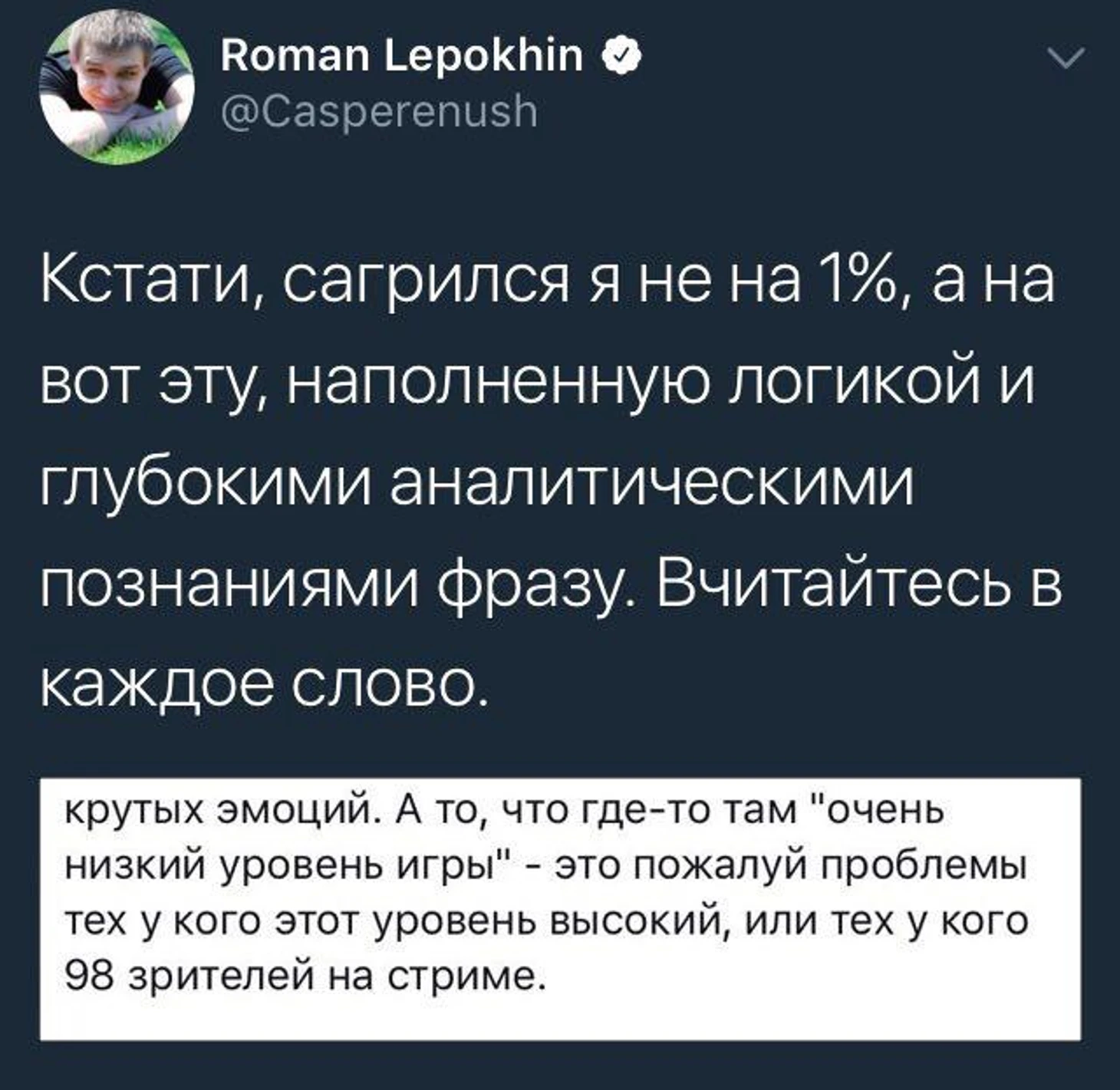 Да, Рухаб сейчас - это монополисты, как бы СЛТВ не хотел составить конкуренцию. Монополисты за счет медийных личностей, вроде Дреда, Хвоста и прочих. Монополисты за счет денег, которые они вбухивают во все это. И это не плохо, пусть и дальше вбухивают и развивают киберспорт. Вот только то, что Вилат сравнивает и делает укор в сторону СЛТВ немного некрасиво. Это как сравнивать условный Реал Мадрид и клуб средней руки. Разные финансовые возможности. Поэтому СЛТВ и приходится довольствоваться.. хмм, а кем? Честно, кроме Каспера и Санлайта толком никого не знаю. Слышал пару раз Друга и Бафика. Вот она медийность. Поэтому и предпочитает аудитория слушать шутеечки от Дреда и компашки, а не аналитику от "ноунеймов". И при этом не особо сравниваю качество аналитики (т.к. не особо часто смотрю русскоязычные трансляции).