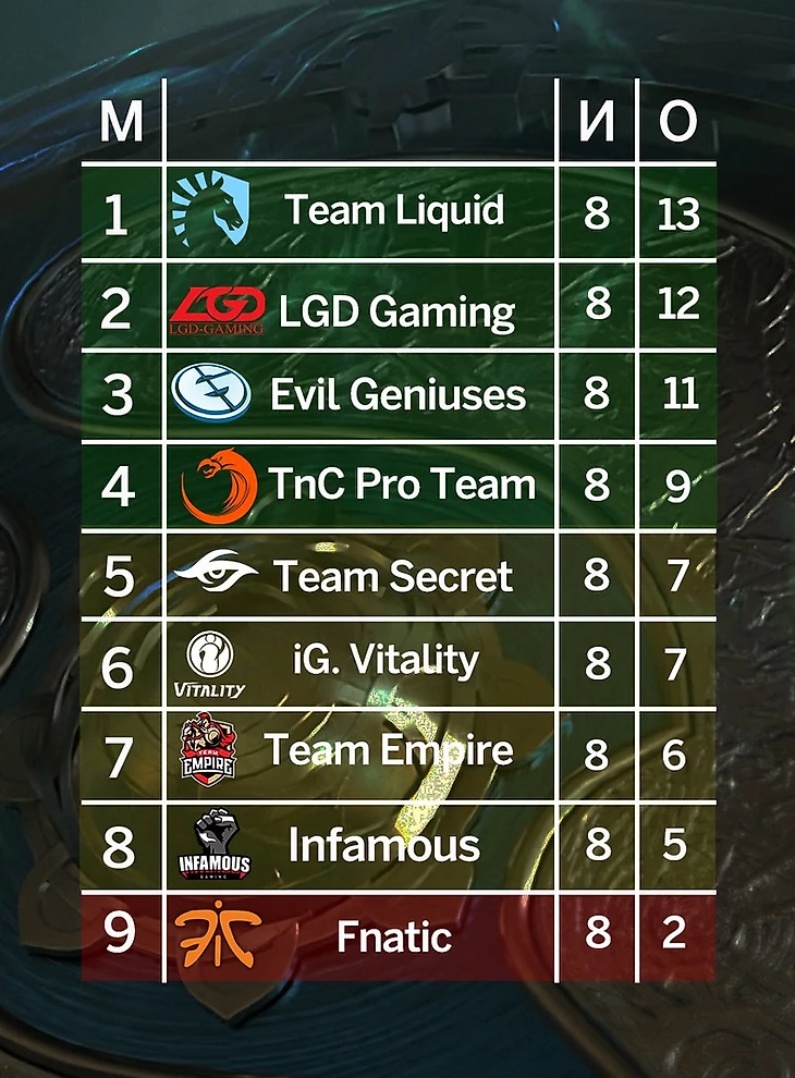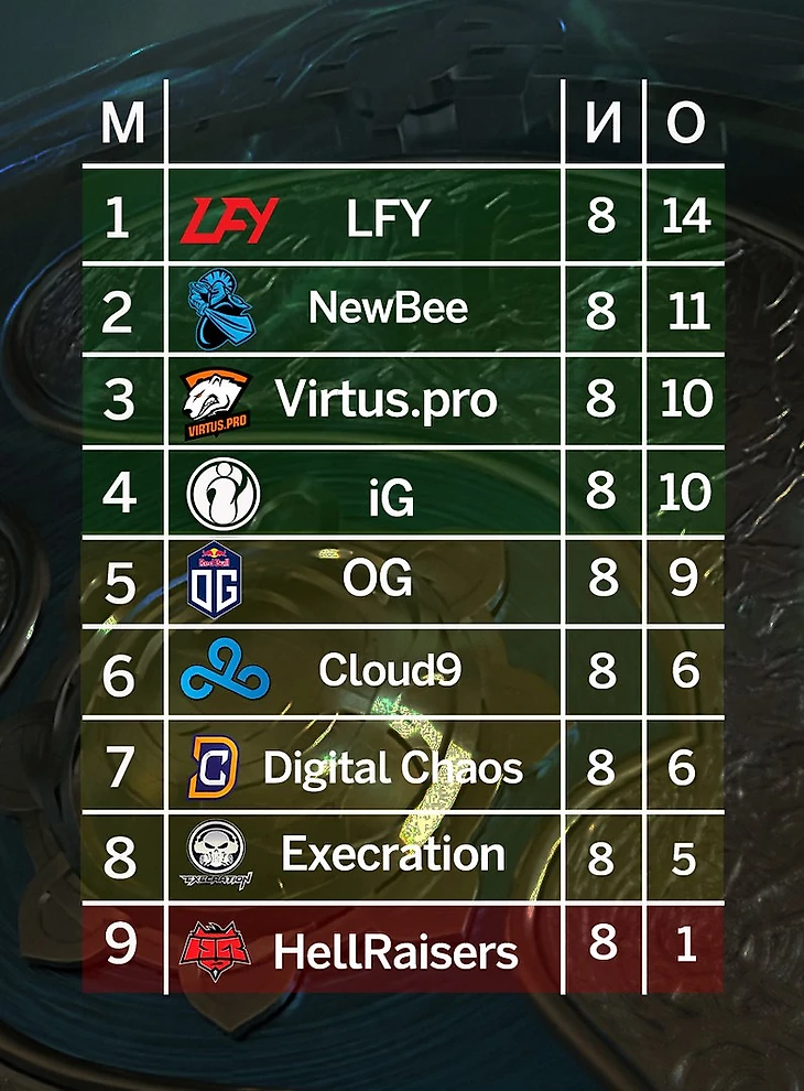 00:30 Virtus.pro – Cloud9 [1:1] (игра 1) (игра 2)00:30 LGD.Forever Young – Invictus Gaming [2:0] (игра 1) (игра 2)00:30 Newbee – Execration [2:0] (игра 1) (игра 2)00:30 OG – HellRaisers [2:0] (игра 1) (игра 2)03:00 Team Liquid – LGD.Gaming [1:1] (игра 1) (игра 2)03:00 Team Secret – iG.Vitality [1:1] (игра 1) (игра 2)03:00 TNC Pro Team – Team Empire [1:1] (игра 1) (игра 2)03:00 Fnatic – Infamous [1:1] (игра 1) (игра 2)05:30 OG – Virtus.pro [0:2] (игра 1) (игра 2)05:30 LGD.Forever Young – Cloud9 [2:0] (игра 1) (игра 2)05:30 Invictus Gaming – Execration [1:1] (игра 1) (игра 2) 05:30 Digital Chaos – HellRaisers [2:0] (игра 1) (игра 2)19:30 Evil Geniuses – Team Secret [1:1] (игра 1) (игра 2)19:30 TNC Pro Team – iG.Vitality [1:1] (игра 1) (игра 2)19:30 Fnatic – Team Empire [0:2] (игра 1) (игра 2)19:30 LGD.Gaming – Infamous [2:0] (игра 1) (игра 2)22:00 Newbee – LGD.Forever Young [0:2] (игра 1) (игра 2)22:00 Invictus Gaming – Cloud9 [0:2] (игра 1) (игра 2)22:00 Digital Chaos – Execration [2:0] (игра 2)22:00 Virtus.pro – HellRaisers [2:0] (игра 1) (игра 2)