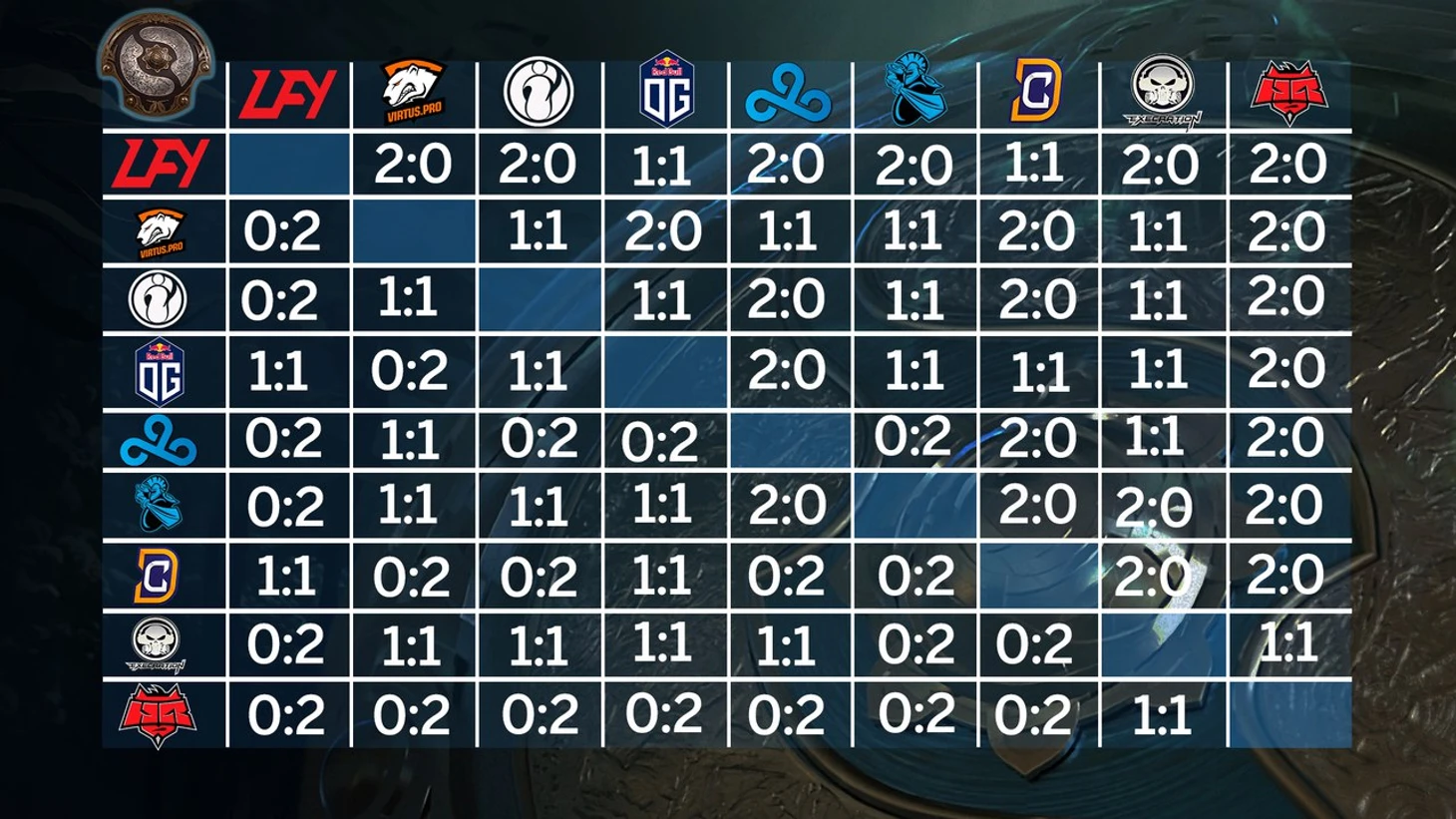 19:00 Evil Geniuses – TnC Pro Team [1:1] (игра 1, игра 2)19:00 Team Secret – Team Empire [1:1] (игра 1, игра 2)19:00 LGD – Fnatic [2:0] (игра 1, игра 2)19:00 Team Liquid – iG Vitality [2:0] (игра 1, игра 2)22:00 NewBee – Invictus Gaming [1:1] (игра 1, игра 2)22:00 Virtus.pro – Digital Chaos [2:0] (игра 1, игра 2)22:00 LFY – Execration [2:0] (игра 1, игра 2)22:00 Cloud9 – OG [0:2] (игра 1, игра 2)3 августа00:30 Evil Geniuses – iG Vitality [1:1] (игра 1, игра 2)00:30 LGD – Team Empire [2:0] (игра 1, игра 2)00:30 Team Liquid – Fnatic [2:0] (игра1, игра 2)00:30 Team Secret – Infamous [1:1] (игра1, игра 2)03:00 LFY – HellRaisers [2:0] (игра 1, игра 2)03:00 Virtus.pro – Execration [1:1] (игра 1, игра 2)03:00 Digital Chaos – OG [1:1] (игра 1, игра 2)03:00 NewBee – Cloud9 [2:0] (игра 1, игра 2)05:30 Team Empire – Infamous [1:1] (игра 1, игра 2)05:30 TnC Pro Team – Fnatic [2:0] (игра 1, игра 2)05:30 LGD – Team Secret [2:0] (игра 1, игра 2)05:30 Evil Geniuses – Team Liquid [1:1] (игра 1, игра 2)19:30 Newbee – OG [1:1] (игра 1, игра 2)19:30 Virtus.pro – LGD.Forever Young [0:2] (игра 1, игра 2)19:30 Invictus Gaming – Digital Chaos [2:0] (игра 1, игра 2)19:30 Execration – HellRaisers [1:1] (игра 1, игра 2)22:00 Team Secret – TNC Pro Team [1:1] (игра 1, игра 2)22:00 LGD.Gaming – iG.Vitality [0:2] (игра 1, игра 2)22:00 Evil Geniuses – Team Empire [2:0] (игра 1, игра 2)22:00 Team Liquid – Infamous [2:0] (игра 1, игра 2)