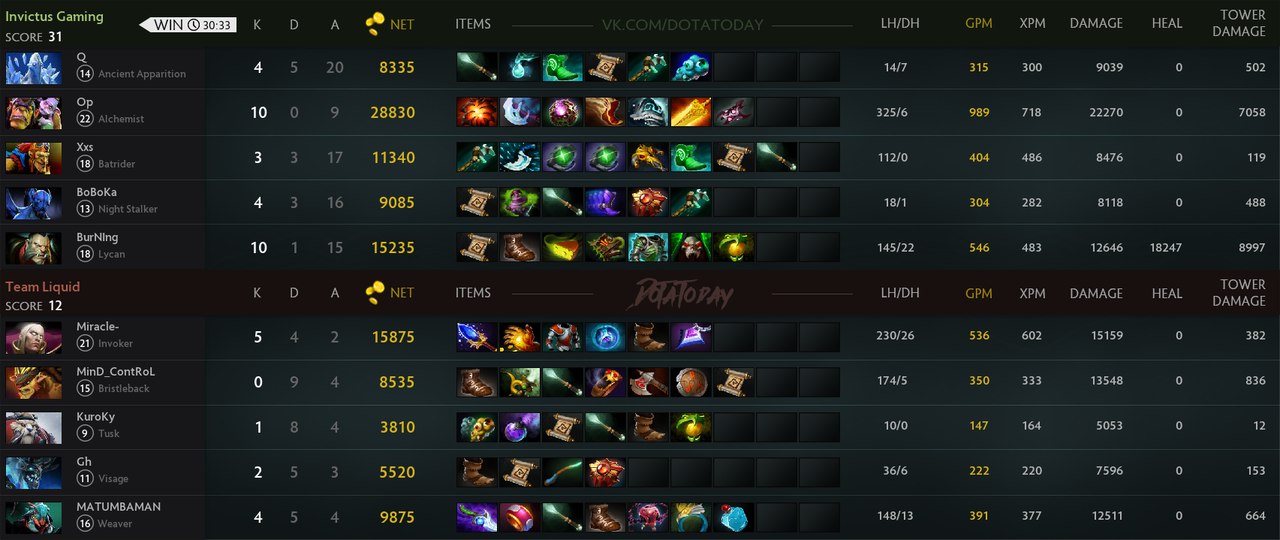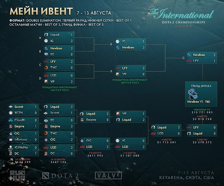 20:00 Team Liquid – Team Empire [2:0[ (игра 1) (игра 2)23:20 OG – LGD Gaming [0:2] (игра 1) (игра 2)02:40 Virtus.pro – Team Liquid [1:2] (игра 1) (игра 2) (игра 3)06:00 Матч всех звезд. Team Radiant – Team Dire [1:0] (таблица)11 августа 20:00 Invictus Gaming – LGD Gaming [0:2] (игра 1) (игра 2)23:00 Newbee – LFY [2:1] (игра 1) (игра 2) (игра 3)02:00 Team Liquid – LGD Gaming [2:0] (игра 1) (игра 2)
