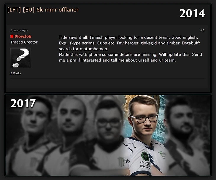 «Оффлейнер с 6к ММР.Финский игрок ищет достойную команду. Хороший английский. Опыт: скримы через скайп, турниры и т.д. Любимые герои: Tinker, Lone Druid и Timber. Dotabuff: ищите matumbaman. Пишу с телефона, поэтому не хватает некоторых деталей. Напишите в личку, если заинтересованы, и расскажите о себе и своей команде».