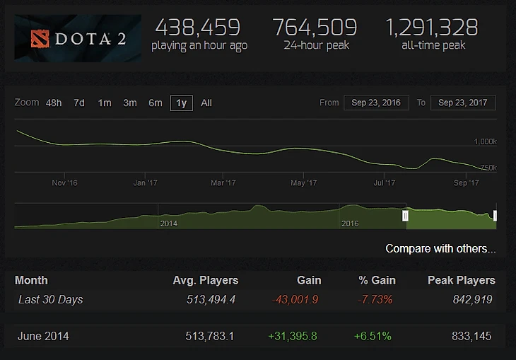 Вчера мы все изучали этот печальный график: число активных игроков в Dota продолжает падать. Меньше чем за год ушли 250 тысяч человек.