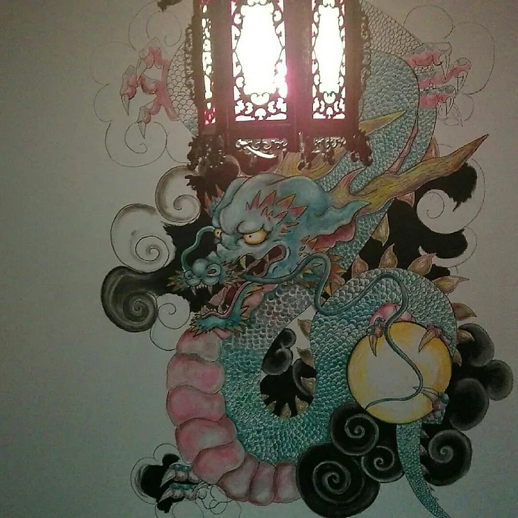 К настоящему моменту Нико почти закончил обустраивать дом. Он отделывает его в японском стиле; его девушка – художник и нарисовала вот этого дракона на стене.
