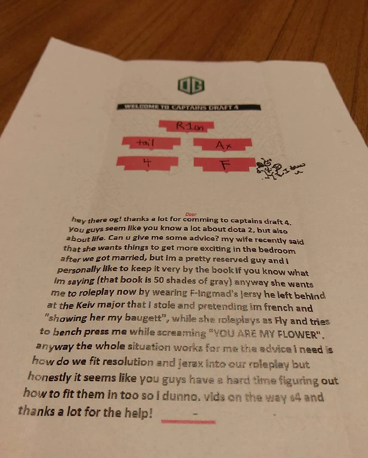 Все знают, что SirActionSlacks – парень юморной. Но перед турниром Captains Draft он, кажется, превзошел себя. Слакс разослал участникам приветственные письма, и они настолько смешные, что команды решили ими поделиться. Наслаждайтесь его бурной фантазией.