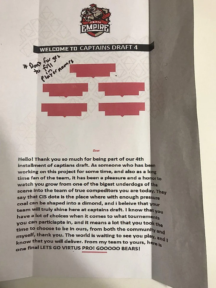 Здравствуйте! Спасибо за ваше участие в нашем 4-ом Captains Draft. Как для человека, работающего над этим проектом, а также являющегося давним болельщиком команды, для меня было удовольствием и честью наблюдать за вашим ростом из андердогов в конкурентную команду, которой вы сегодня являетесь. Говорят, СНГ-дота – это место, где под должным давлением уголь превращается в алмаз, и я верю, что ваша команда действительно засияет на Captains Draft.