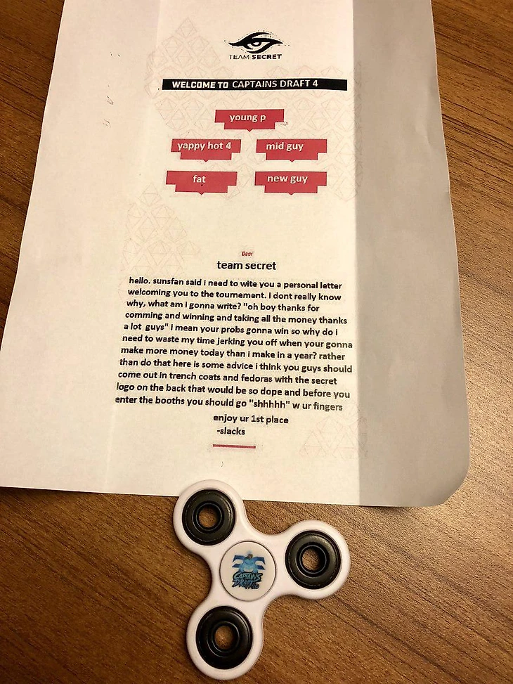 *Среди ников – Жирдяй, чувак с мида, новый чувак.Привет, Sunsfan сказал, что мне нужно написать вам письмо, чтобы поприветствовать вас на турнире. Не знаю, почему, да и что мне нужно написать? «Парни, спасибо большое, что приехали, победили и забрали все деньги»? В смысле, вы скорее всего победите, так почему я должен тратить врмя и вымораживать вас, если вы сегодня заработаете больше денег, чем я за год? Я бы посоветовал вам выйти на турнир в офигительных пальто и фетровых шляпах с лого Team Secret на спине, и перед тем, как зайти в игровые кабинки, сказать всем «шшшш» и поднести палец к губам. Наслаждайтесь первым местом.