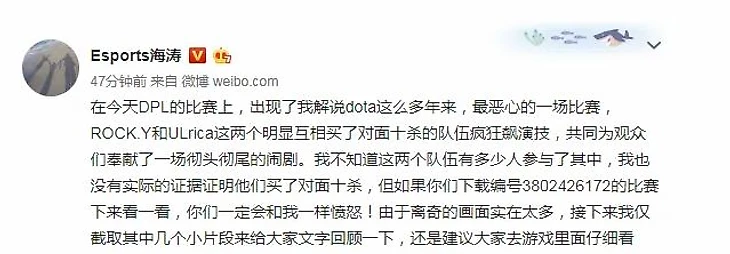Вчера во втором дивизионе китайской лиги DPL команды Ulrica и Rock.Y сыграли между собой очень странный матч. Обычно при договорняке одна команда нарочно сливает игру другой. В этом же матче поиграть в поддавки решили и Ulrica и Rock.Y. Игроки обеих команд умирали в самых немыслимых ситуациях, промахивались скиллами или же не кастовали их вовсе. Такое странное поведение заметили комментаторы, работавшие на матче. А один из самых известных китайских кастеров под ником Haitao в порыве возмущения написал на Weibo разоблачительный пост.