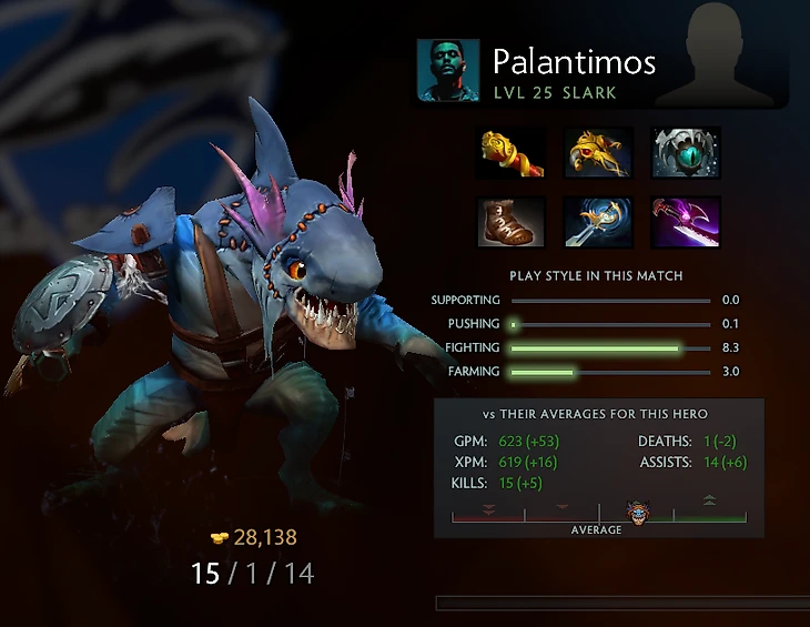 Дальше – веселее. Вега на третьей карте взяли забытого всеми Сларка. Получилось очень даже неплохо – Palantimos постоянно делал соло-фраги, вносил много импакта в замесе. Вот так выглядела его итоговая статистика: