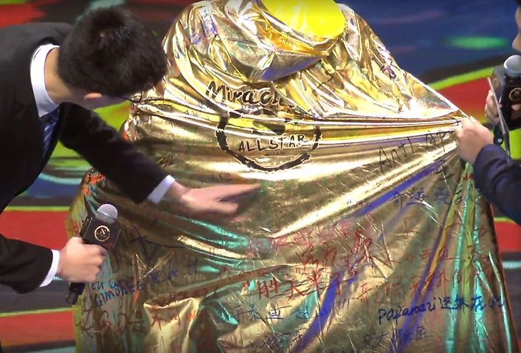 Тема с плащами, на которых расписались звезды китайской Доты, была довольно странной. Всех игроков заставляли поворачиваться спиной к аудитории, чтобы ведущие смогли найти на них очередное имя. Больше было похоже на киберспортивный утренник.