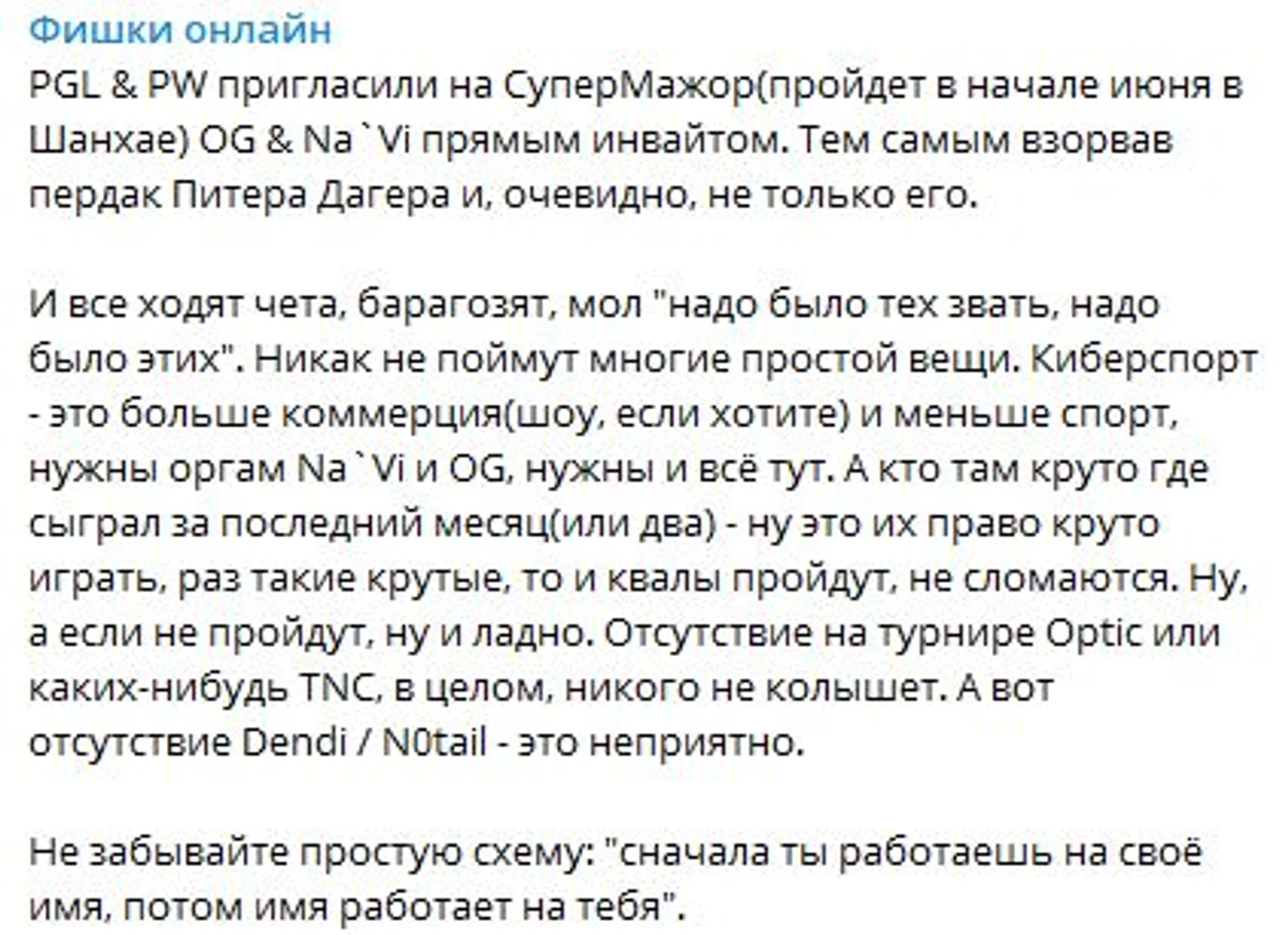 «Система DPC позорит себя тем, что на последний и самый ценный турнир от Perfect World и PGL приглашают EG, которые проиграли две последние североамериканские квалификации, и OG. Последние даже не претендуют на рейтинговые очки. Это грустно».