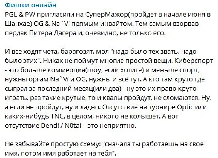«Я дважды проверил, не ошибся ли я, и оказалось, что нет. PGL и Perfect World окончательно подтвердили, что каждая из команд, приглашенных на Supermajor, получила инвайты по электронной почте 19 Марта, сразу после GESC и за 10 дней до DAC».