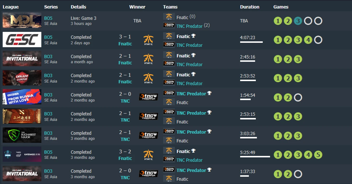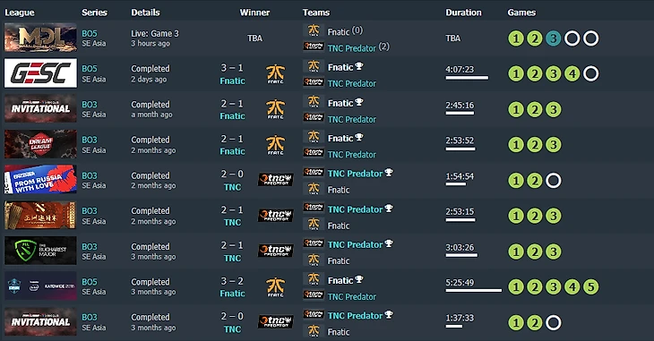Ситуация усугубляется тем, что в SEA-регионе сильных соперников мало. По факту, есть три действующих силы: Fnatic, TNC и Mineski. Как следствие, матчи TNC-Fnatic стали проходить ну очень часто. За последние три месяца они сыграли 9 (!) серий между собой, три из которых – bo5: