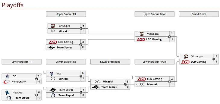 В плей-офф выходят по 4 команды из каждой группы: две в верхнюю сетку, две в нижнюю. Теоретически, для выхода из группы должно хватить двух побед. Если у Team Empire шансов (с точки зрения Эло) практически нет, то FTM еще может побороться. Если предположить, что Сайлент обыграет свою бывшую команду в очной встрече (напомним, шанс на это больше 60%), то парням останется выиграть еще одну игру, чтобы надеяться на плей-офф. Наибольшие шансы на победу у FTM в игре против Complexity – 42% при К=32, 29% при К=64. По сути, это и есть шанс FTM на выход из группы, при условии, что LGD, Mineski и Team Liquid не проиграют никому, кроме друг друга.