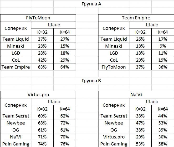FlyToMoon и Team Empire – две слабейшие команды группы А, Virtus.pro – сильнейшая команда турнира. Ключевой момент здесь – используемый коэффициент. Сайт Нахаза и Ноксвилля использует два различных коэффициента: 32 и 64. Подставив нужные значения в соответствующую формулу, мы получим следующее: