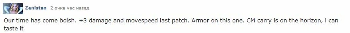«Наше время пришло. Улучшение скорости передвижения и +3 к урону в прошлом патче. А в этом добавили броню. Грядет эпоха CM-керри, я чувствую это».