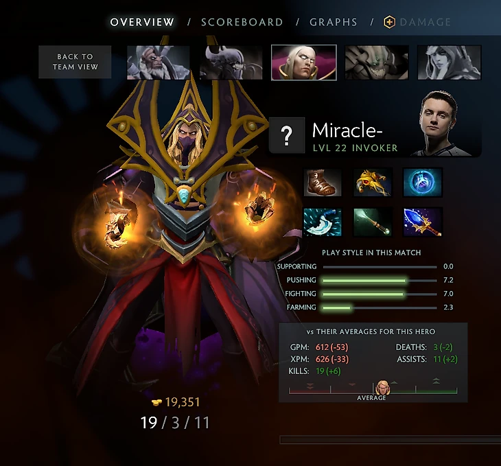 Финальная статистика Миракла. По шкале результативности, это его типичная игра, и ничего, что 17 фрагов к 30-й минуте – это рекорд для Инвокера за последние три года профессиональной доты (может, и больше, просто статистика только с 2015-го).