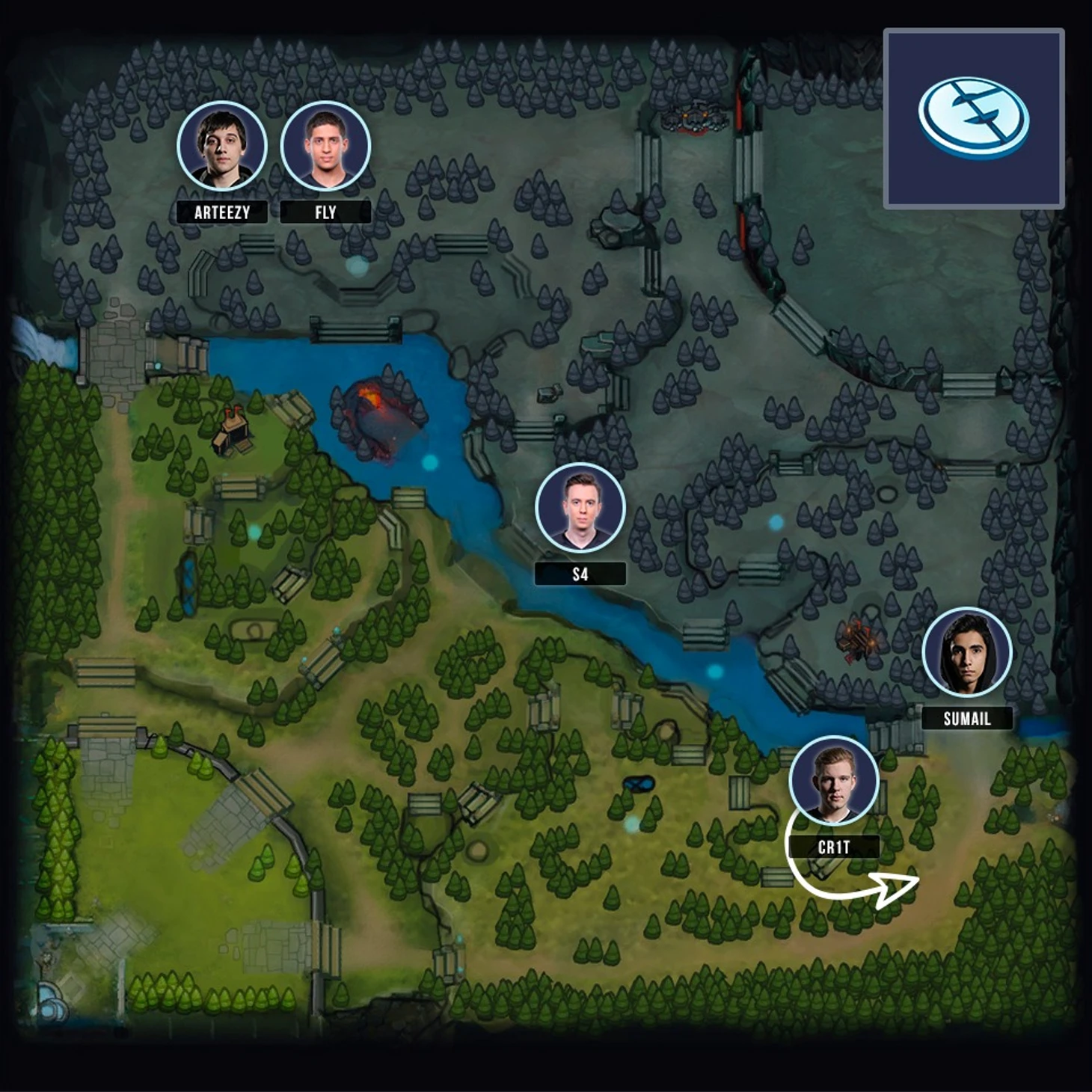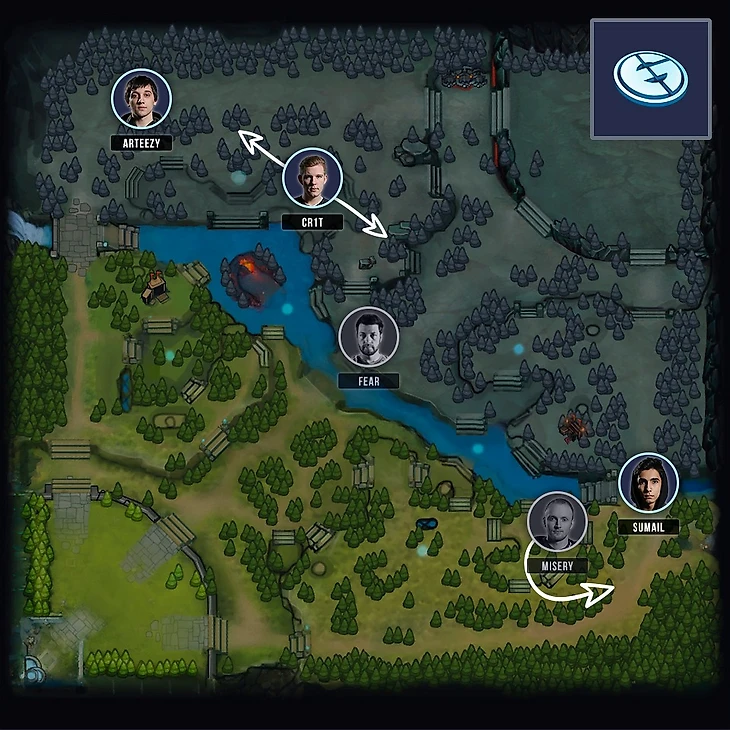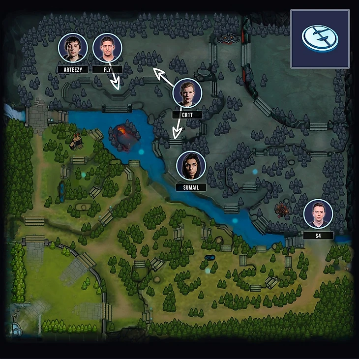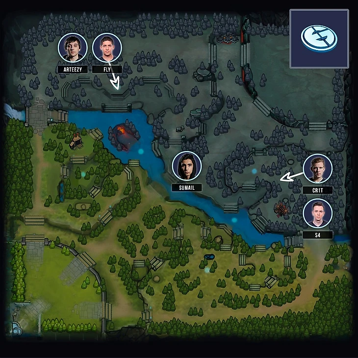 Популярный в текущей мете лайнинг: 2 - 1 - 2 с подключающимися для сейва саппортами. Вряд-ли похоже на правду в случае EG, слабо верится, что при переходе на mid и возврате к старому пуллу героев, Sumail-а перестанут опекать на линии. Столь агрессивные четверки, как пару версий назад сейчас встречаются реже, но целенаправленно задушить для создания напряжения = тильта в сопернике, команды топ уровня уже научились. Да и пространство, которое Fly за счёт занимаемой позиции дает Cr1t явно говорит, что Злые гении предпочтут использовать силу активной четверки во всю.