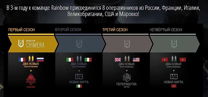 Сезоны в Rainbow Six – крупные обновления игры, в рамках которых происходит улучшение игрового процесса, а также добавляются карты, функции или игровые режимы, оперативники, раскраски для оружия и элементы персонализации.