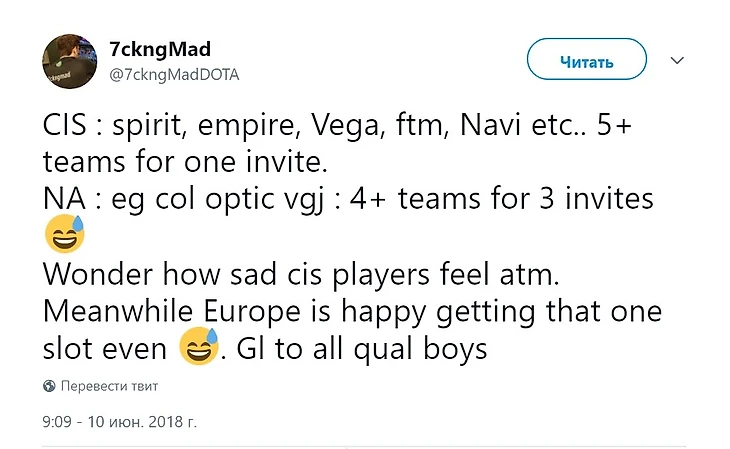 Ну а теперь давайте уже поговорим о наших реалиях, о нашем любимом СНГ. Вообще если опять окунаться в историю, то Европа + СНГ это почти всегда были главные квалификации, они почти всегда оставались на последние дни, они почти всегда собирали максимальную аудиторию на Твитче, да и просто почти всегда они были самыми интересными. И если в этом году Европа заметно просела, кроме ОГ мы, по сути, и о командах тир-2,3 уровня и не слышали, разве что поляки из Team Kinguin с 90 очками. И, наверное, один слот для них может и хорошо, хотя я бы сделал по-другому, но о этом чуть ниже. В СНГ же постоянно появлялись команды, которые ехали на Мажоры и Миноры. Эффект, Эмпаер, Вега, Спирит, Нави и главное топ-3 Эпицентра ФТМ. И самое забавное, недовольны одни слотом для СНГ были не только болельщики, но даже капитан команды ОГ Ceб, в своем твиттере, отписал то, что на 5 сильных команд из СНГ 1 инвайт, а на 4 американские 3.