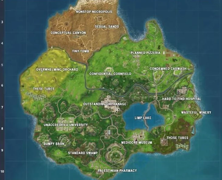Поклонники Battle Royal тоже любят поиграть со словами. Сотрудники компании Botnik Studios с помощью собственной нейросети разработали новую карту для Fortnite. Особенность их работы заключается в том, что все названия ключевых точек были придуманы машиной по принципу аллитерации – выбирались наиболее созвучные сочетания слов из мира игры.