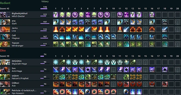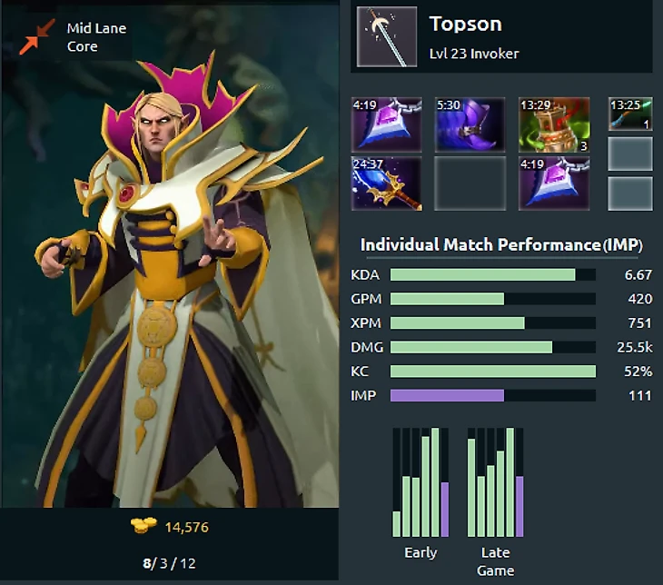 Topson отличается типично паберской агрессией и значительную часть своего нетворса набирает за счет фрагов. Вот так выглядит стандартный лайнинг нового мидера OG: