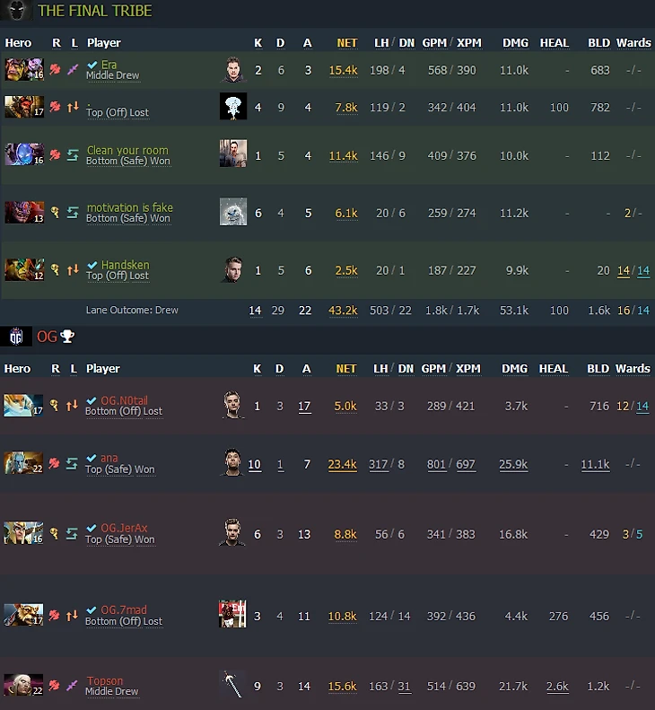OG обошлась без кадровой революции: вместо нее случилась идейная. Ролевики OG получили свободу, которой у них никогда не было раньше. Им пикают выпавших из меты сигнатурных героев, дают полный карт-бланш в ранней игре и мидгейме, и в целом команда играет в довольно веселую доту. Что сейчас, в мете аксов-скаймагов-ликанов, большая редкость.