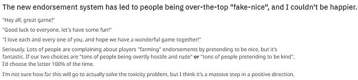 «Всем привет, отличная игра! Удачи, повеселимся! Я люблю всех вас и надеюсь, что мы отлично отыграем вместе! А теперь серьезно. Многие люди жалуются на игроков, которые «фармят» похвалы и притворяются хорошими. Но это же замечательно! Если выбирать между людьми, которые ведут себя грубо и враждебно, и людьми, которые притворяются добрыми, я бы в 100 случаев из 100 выбрал бы вторых. Я не уверен, насколько это поможет решить проблему токсичности, но думаю, что это огромный шаг в нужном направлении».