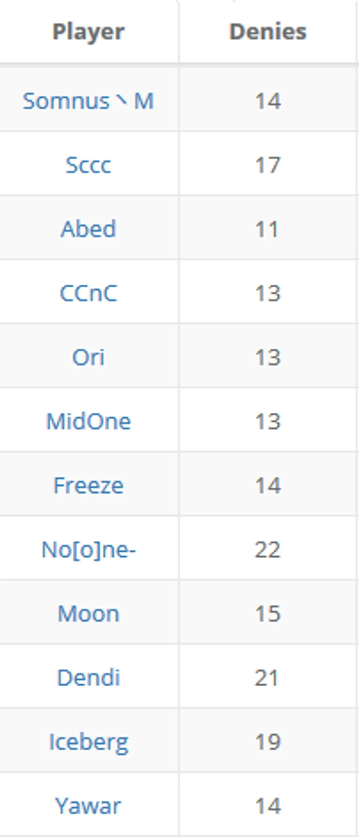 Если еще немного углубиться в исследование стадии лайнинга, можно найти параметр, в котором Денди – один из лучших в мире. Это денаи. Кайл Фридман при любом удобном случае напоминает всем, что механика денаев сейчас максимально поломана и является одной из главных причин успеха VP в этом сезоне. Денаи крипов действительно являются очень важным параметром, т.к. вы не только отнимаете у врага золото и часть опыта, но и получаете немного экспы для себя. Сравним Денди с лучшими мидерами нынешнего сезона: