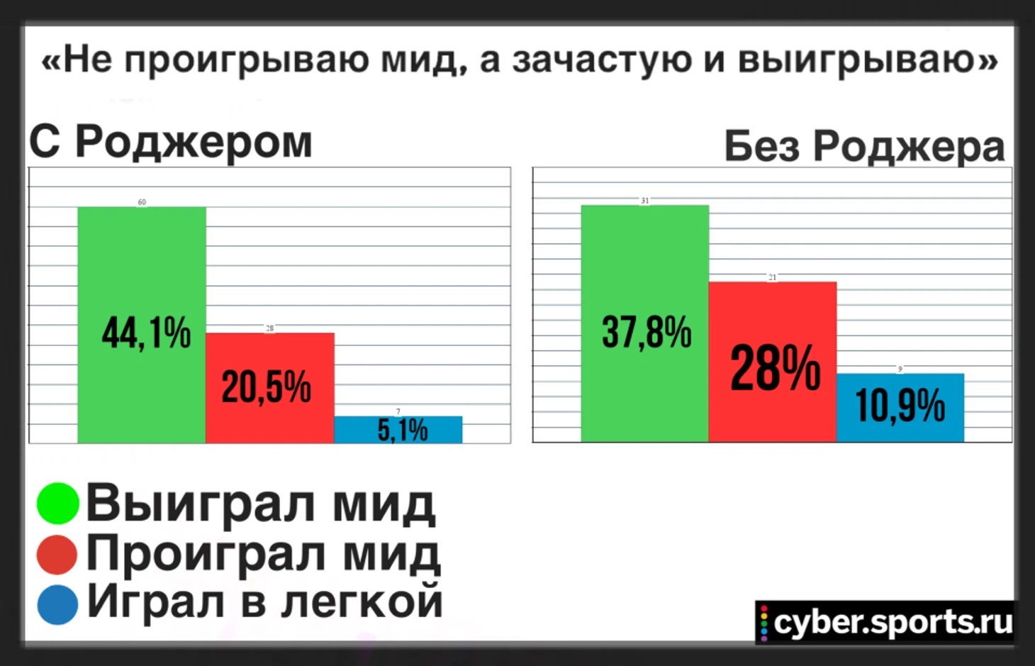 По средним показателям Денди и правда не проигрывает мид. С Роджером в составе его средний нетворс за 12 минут составлял 4738 единиц золота, у его оппонента на линии – 4315. По добитым крипам Данил также опережал соперника – 72 против 64. Хотя перевес в 400 золота и 8 крипов нельзя назвать критическим, но определенное преимущество Денди перед среднестатистическим вражеским мидером налицо. Кроме того, при поддержке Роджера Денди выигрывал мид едва ли не в половине случаев.