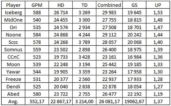 HD – урон по героям, TD – урон по вышкам, Combined – сумма HD и TD, GS – потраченное золото, UP (Utility Point) – условный коэффициент полезности, который, отображает урон по вышкам или героям, который игрок наносит за каждую потраченную единицу золота. Грубо говоря, это игровой КПД. Как выяснилось, у Айсберга этот параметр на запредельном уровне – каждую потраченную единицу золота он конвертирует в полторы единицы урона по героям или вышкам. Не сильно отстают No[o]ne, MidOne и Ori.