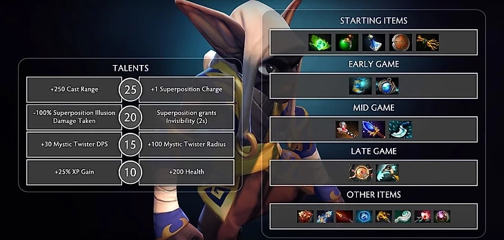 Ультимейт, прокачивается на уровнях 3, 10 и 17. Телепортирует вас в указанную точку в радиусе 600, оставив на прошлом месте иллюзию. Если вы примените Superposition во время применения одной из прерываемых способностей, ее будет продолжать применять иллюзия.