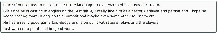 «Я не русский, не говорю по-русски и никогда не видел его трансляций. Теперь я услышал его на английском, и мне нравится, как он комментирует, анализирует и вообще он как человек. Надеюсь он будет работать на Саммите и дальше, и, может быть, и на других турнирах. Он очень хорошо разбирается в доте и знает много интересного про игроков. Просто хотел отметить его хорошую работу».