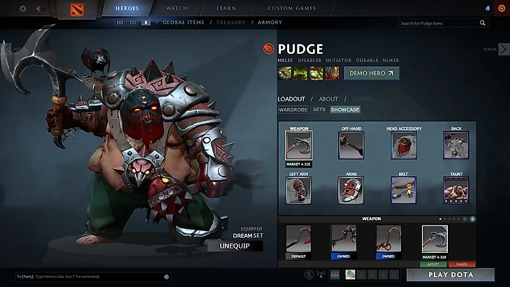 Режим «Демо версии» сета весьма скуден – можно смотреть лишь на полный сет или одиночную вещь. Поверьте, толпа хочет настоящую примерочную сетов. Дайте возможность комбинировать предметы из всех возможных сетов, чтобы быть самым красивым Мясником!