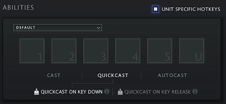 Большинство игроков используют быстрое применение при нажатии клавиши: так способности и предметы используются с меньшим количеством кликов. Но такой метод имеет свой недостаток – при касте не виден радиус применения или область действия АоЕ-заклинания (Chronosphere Войда или Dream Coil Пака). Единственный выход сейчас – настроить кнопку на «обычный каст». Привязать к отдельной клавише быстрый каст, срабатывающей при отжатии, нам не дают – мы можем лишь лишь выбрать, какой из методов быстрого каста будет применяться для всех способностей.