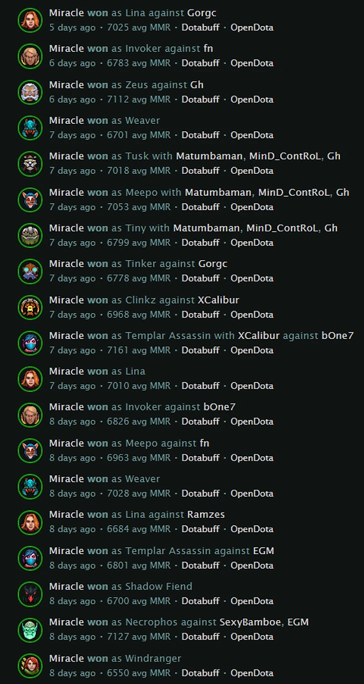 Неделю назад Miracle решил, что пора поднять рейтинг. Иорданский гений выдал серию из 19 победных матчей подряд и сейчас занимает 4-ю позицию в рейтинге – после Матумбы и двух аккаунтов Нуна.