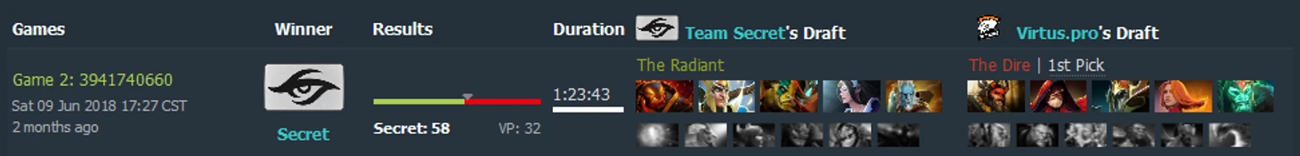 Лишь одинокий вард Radiant на базе Dire намекает на победителя этой игры. Team Secret здесь действительно играла за Свет. Исходя из карты вижена, может показаться, что игра проходила в равной борьбе, и команды до последнего не могли определить победителя. На самом же деле, эта игра закончилась со счетом 20:2, а соперник Team Secret, Vici Gaming, проиграла две линии из трех, и за всю игру ни разу не имела перевеса по золоту. И даже такая игра у Team Secret превратилась в нудное перетягивание каната в районе центральной линии.
