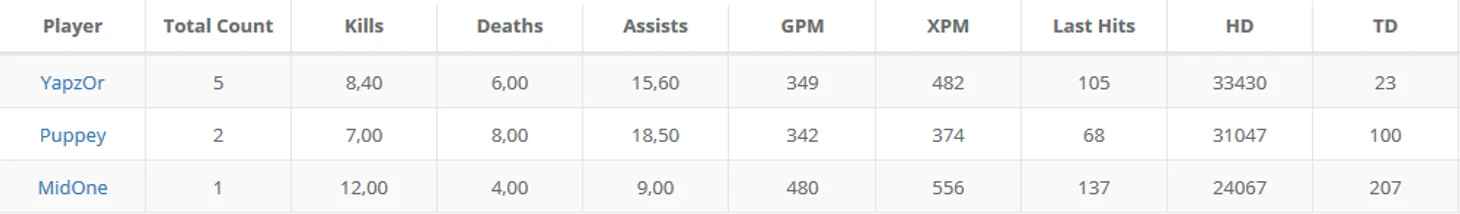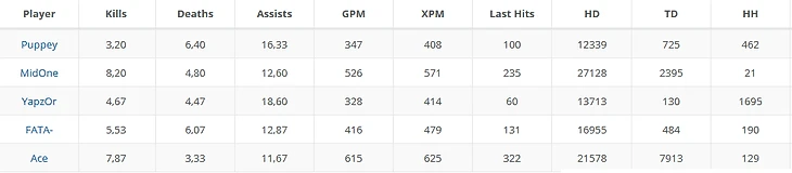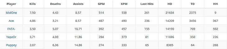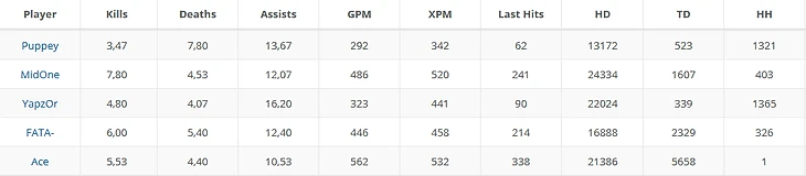 С уроном по героям все не намного лучше. Ace, номинально первая позиция в команде, наносил чуть больше 14 тысяч урона за игру. К слову, fy на Эпицентре вносил почти 16 тысяч здоровья при идентичной средней продолжительности игр. Когда твой керри по части убийства героев уступает вражескому саппорту (пусть даже речь идет о гениальном fy), ты понимаешь, над чем тебе следует поработать.
