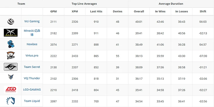При этом нельзя сказать, что LGD – медленная команда. Если взять статистику за последние 10 патчей, то у LGD самая низкая средняя продолжительность игр среди топовых китайских команд и вторая среди всех в топ-8.