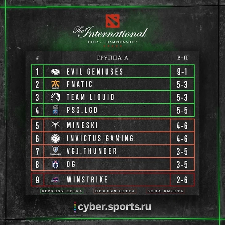 У Winstrike остались очень сложные матчи: EG, Liquid, Fnatic и OG. Видимо, с командой Нотейла основная борьба за 8-е место и пойдет – но нужно сохранить хотя бы математические шансы до встречи команд в последний день группового этапа.