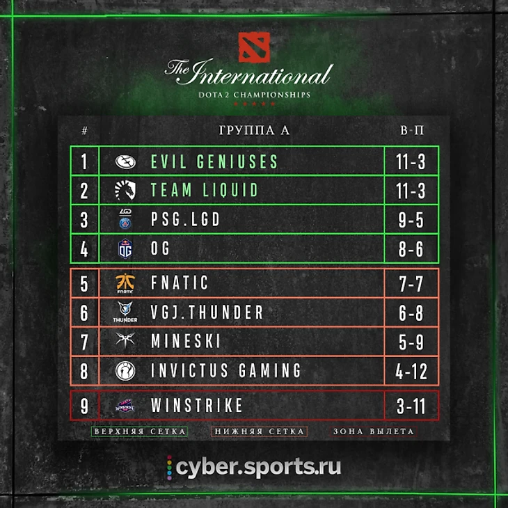 Лучший вариант для российской команды. Winstrike набирает 5-11, занимает 8-е место в группе (Mineski точно выше по личной встрече) и в нижней сетке сыграет... В группе В все непонятно, так что соперник может быть любой: от TNC и Secret до Pain, Serenity или Vici Gaming. У Нонграты будет шанс делом подтвердить свои слова про то, что в группе В соперники удобнее.
