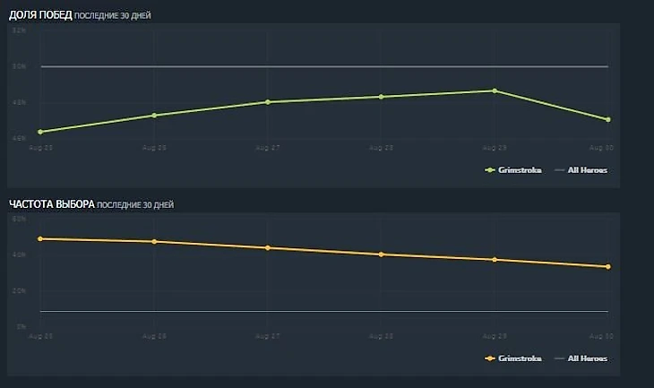 После патча доля побед Грима в ночь с 29 на 30 августа начала стремительно падать, как и его пикрейт.