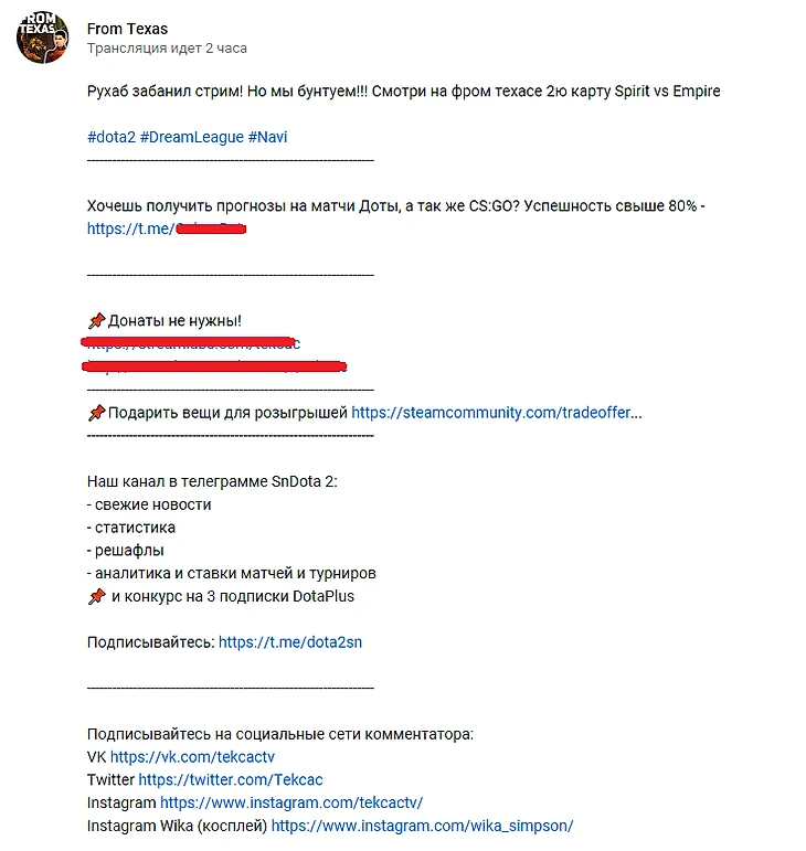 Ярослав после блокировки канала продолжил стримить со второго канала. В твиттере он заявил, что ничего не рекламировал, а на стриме была лишь возможность доната стримеру. Что же, вот так сейчас выглядит описание второго стрима: