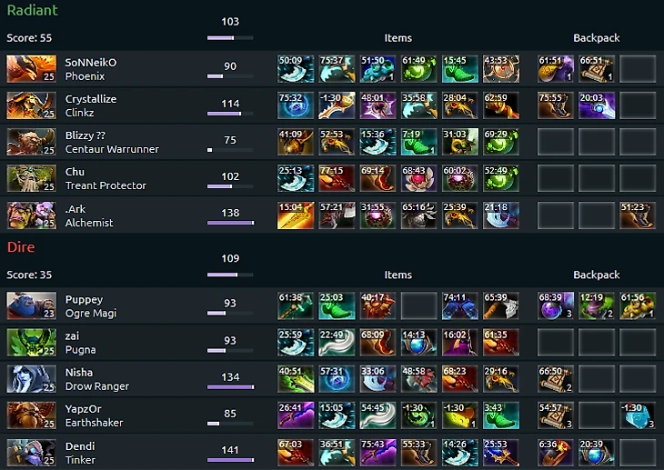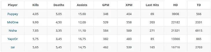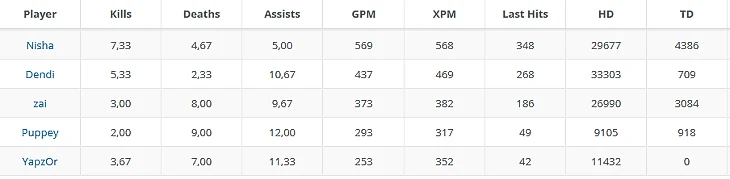 Dendi наносил больше всех урона по героям (да-да, эффект Тинкера) и почти не прикасался к вышкам. Даже на первой карте, где Dendi играл на Drow Ranger, а Zai на Enigma, швед все равно нанес больше урона по зданиям, чем украинец. По ходу серии Zai все так же агрессивно отпушивал линии и постоянно светился на карте, Nisha безопасно фармил в лесах. К схеме Пуппея вопросов нет – он действовал по своим же чертежам.